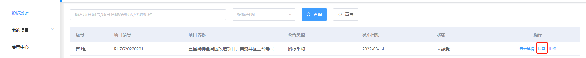 该项目只接受被邀请的供应商参与报名,点击【投标邀请】,点击【同意】后方可搜索到项目进行报名