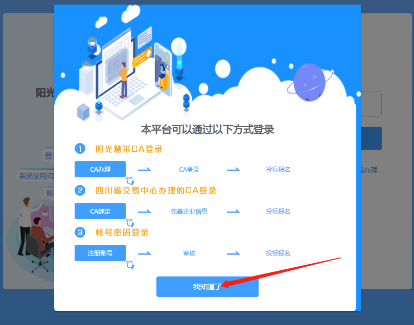 浏览器输入https://zfcgw.com进入阳光慧采供应商管理系统(注册账号建议使用:Google浏览器(点击下载)或360浏览器极速模式),点击【我知道了】。