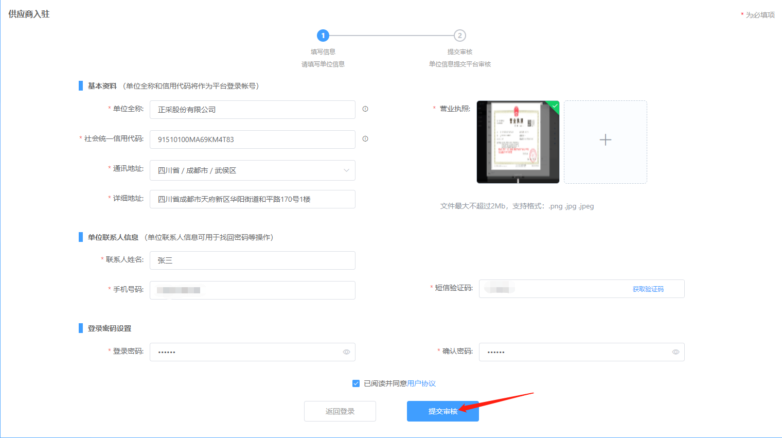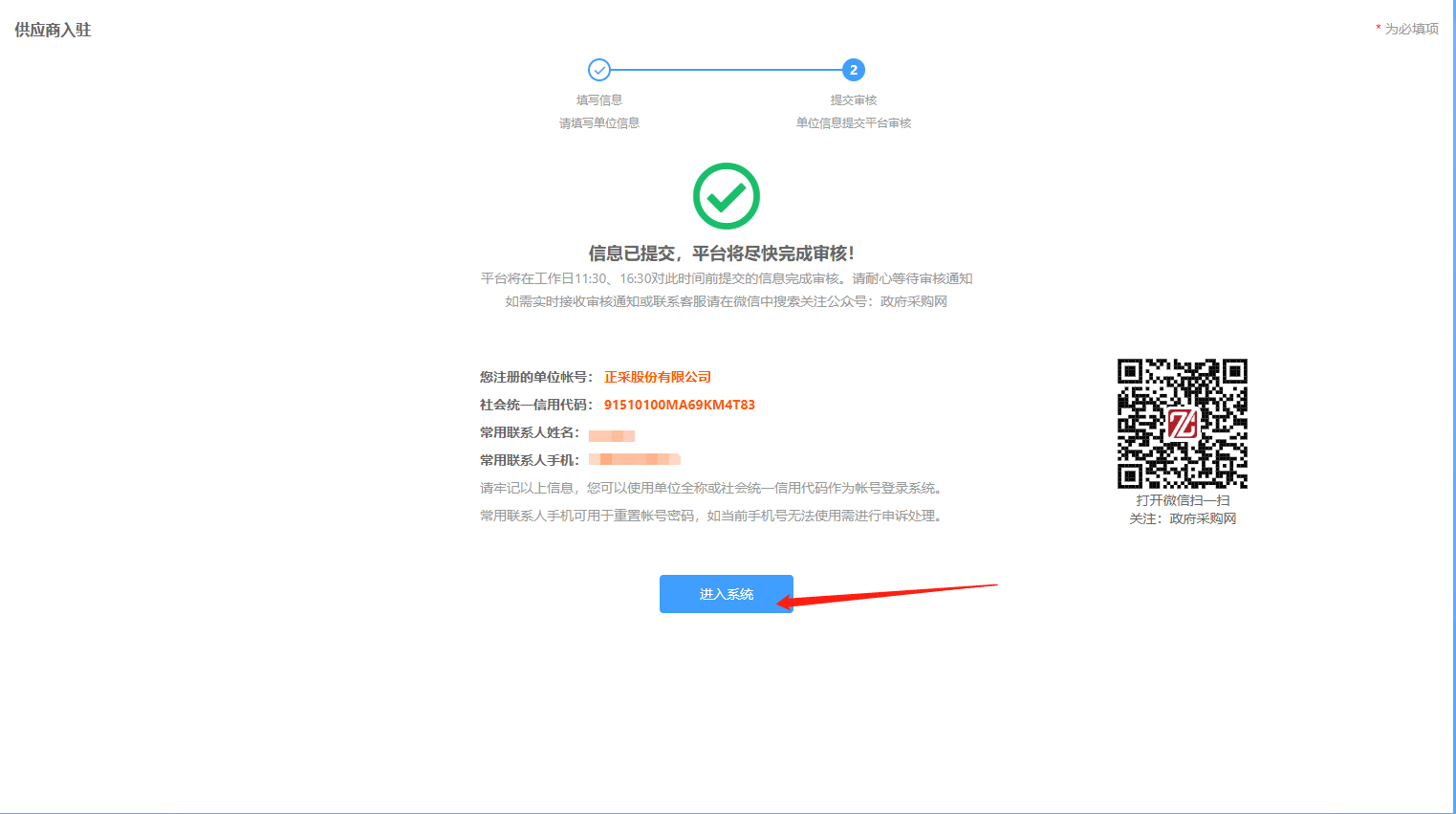 完善公司信息并上传营业执照后点击【提交审核】,等待审核结果。点击【进入系统】可进入系统等待审核结果页面。